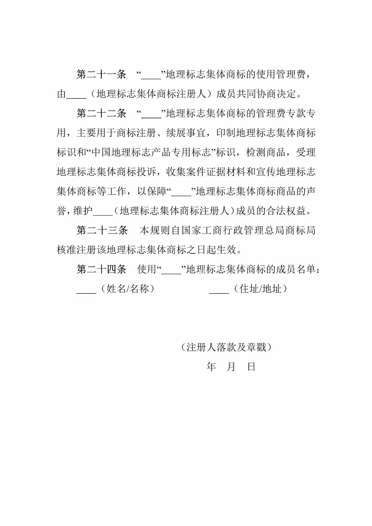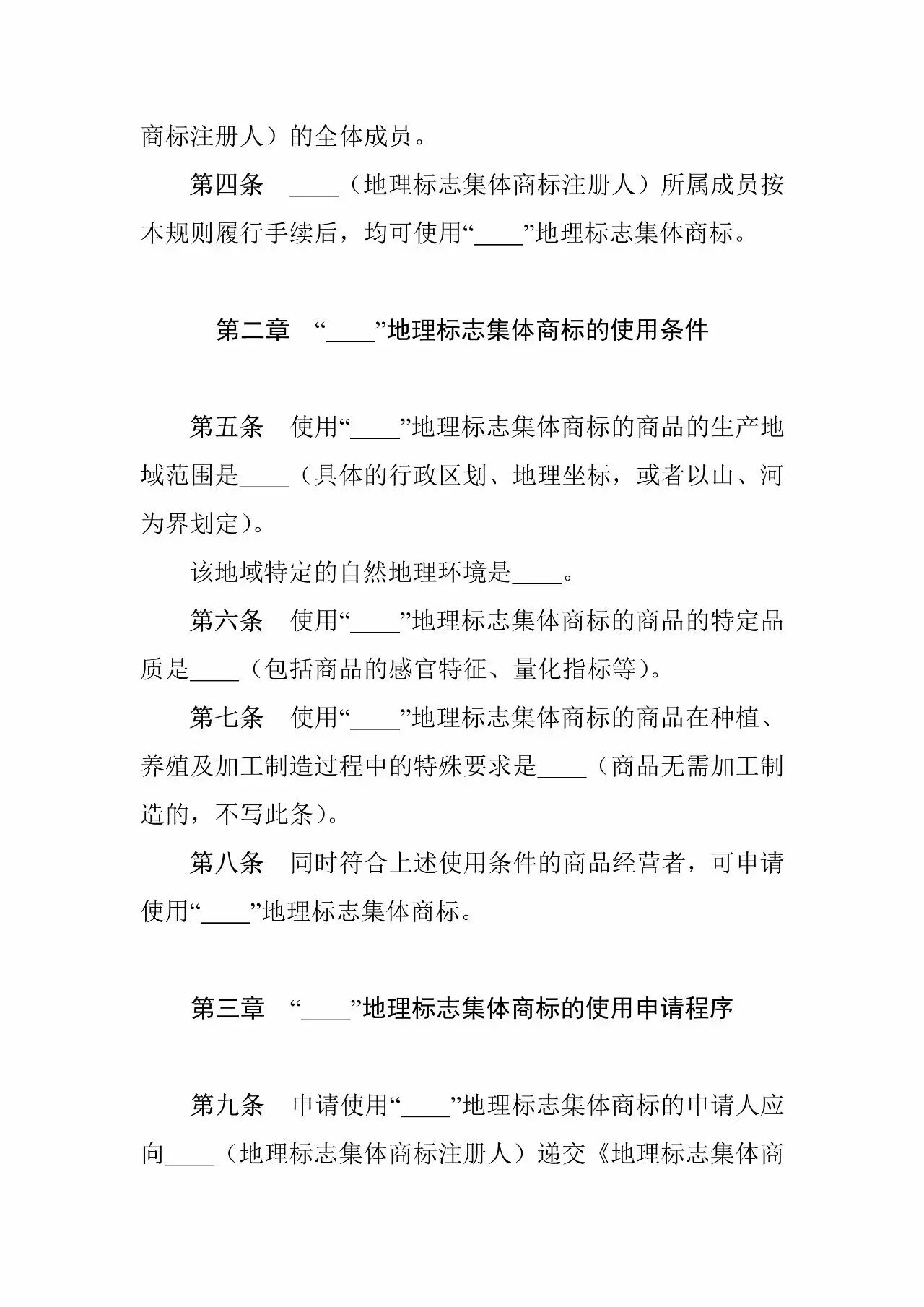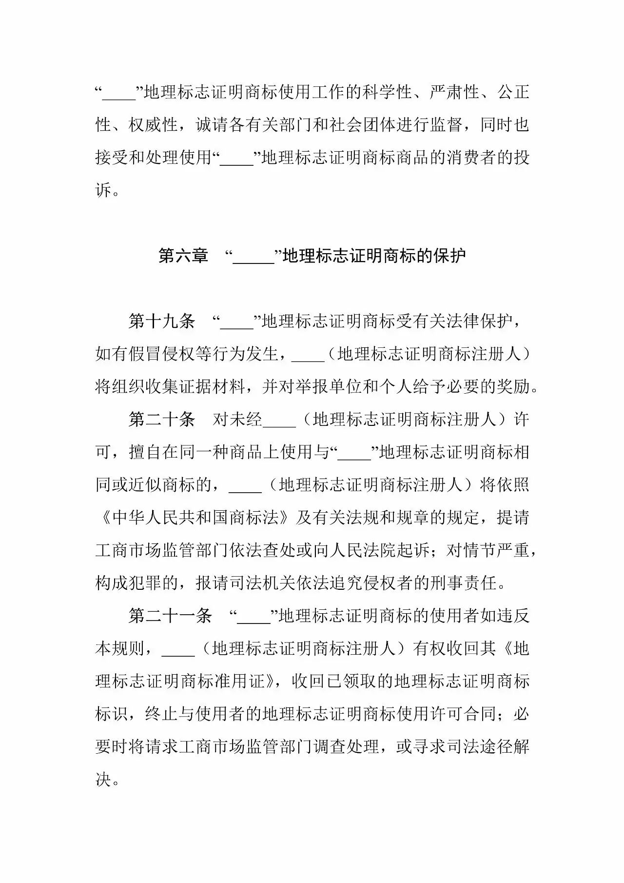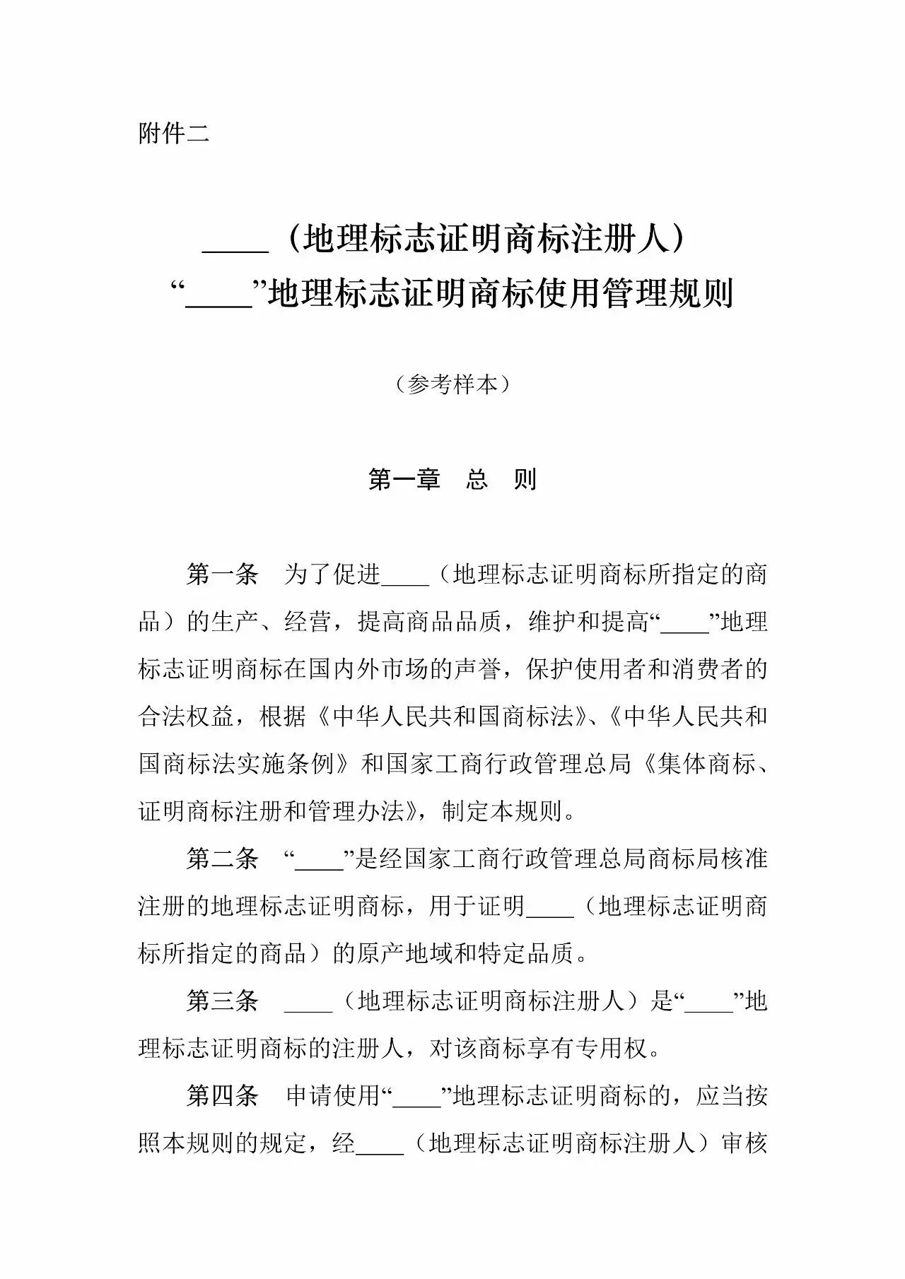 3.根据《商标法》《商标法实施条例》《集体商标、证明商标注册和管理办法》有关规定归纳整理而成的使用管理规则范本(见附件一、二,笔者根据自己的理解,对商标局官网上公布的范本做了修正)中,第五条不但应写明使用地理标志集体商标/证明商标的商品的生产地域范围(包括行政区划和地理坐标),还应描述该地域特定的自然地理环境是如何影响和造就了地理标志商品的特定质量、信誉或其他特征。