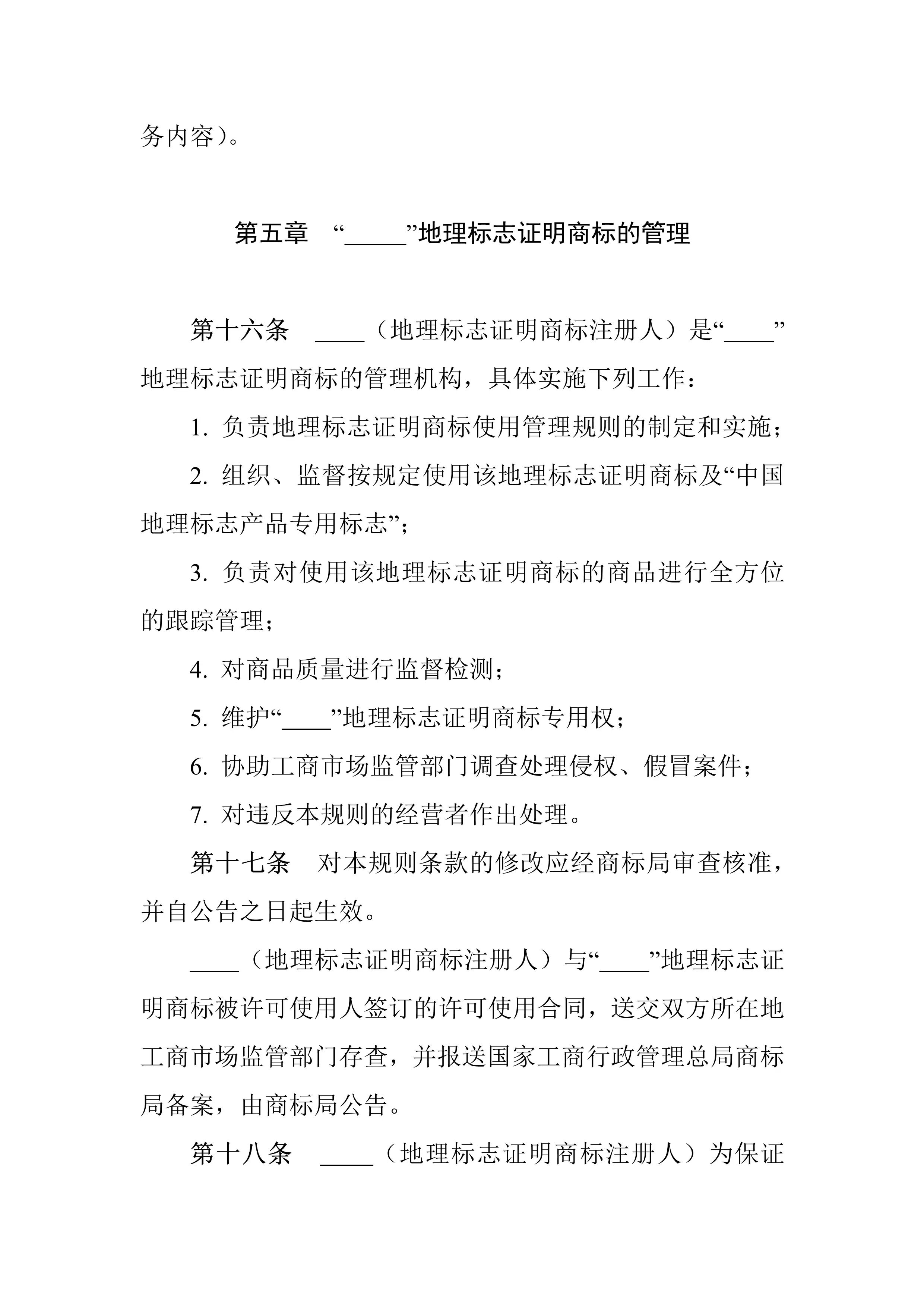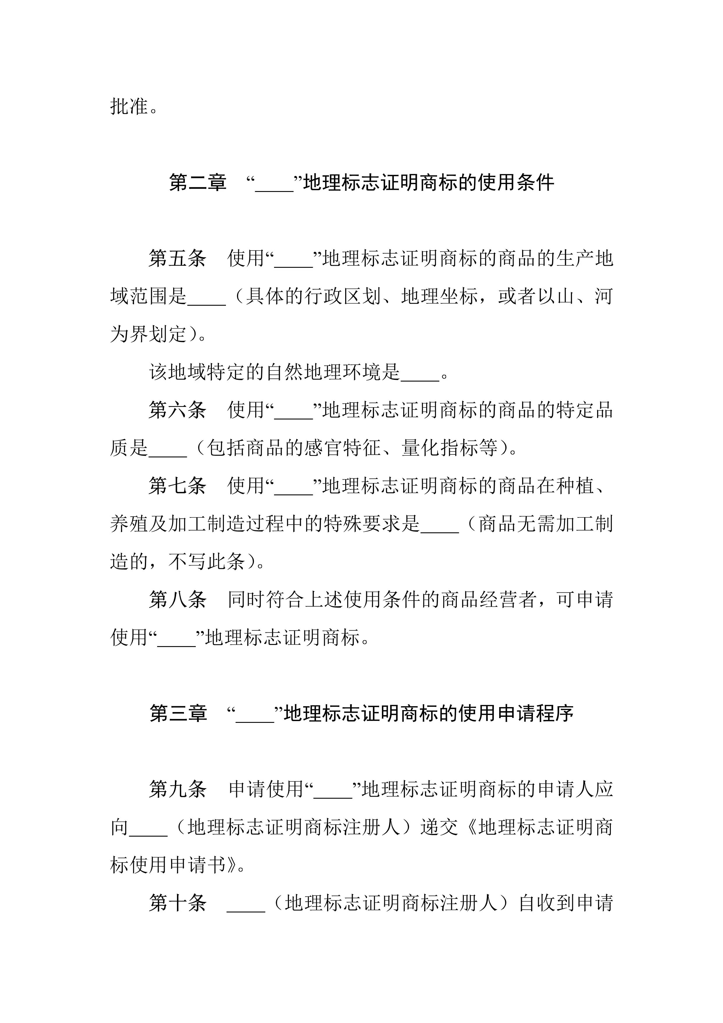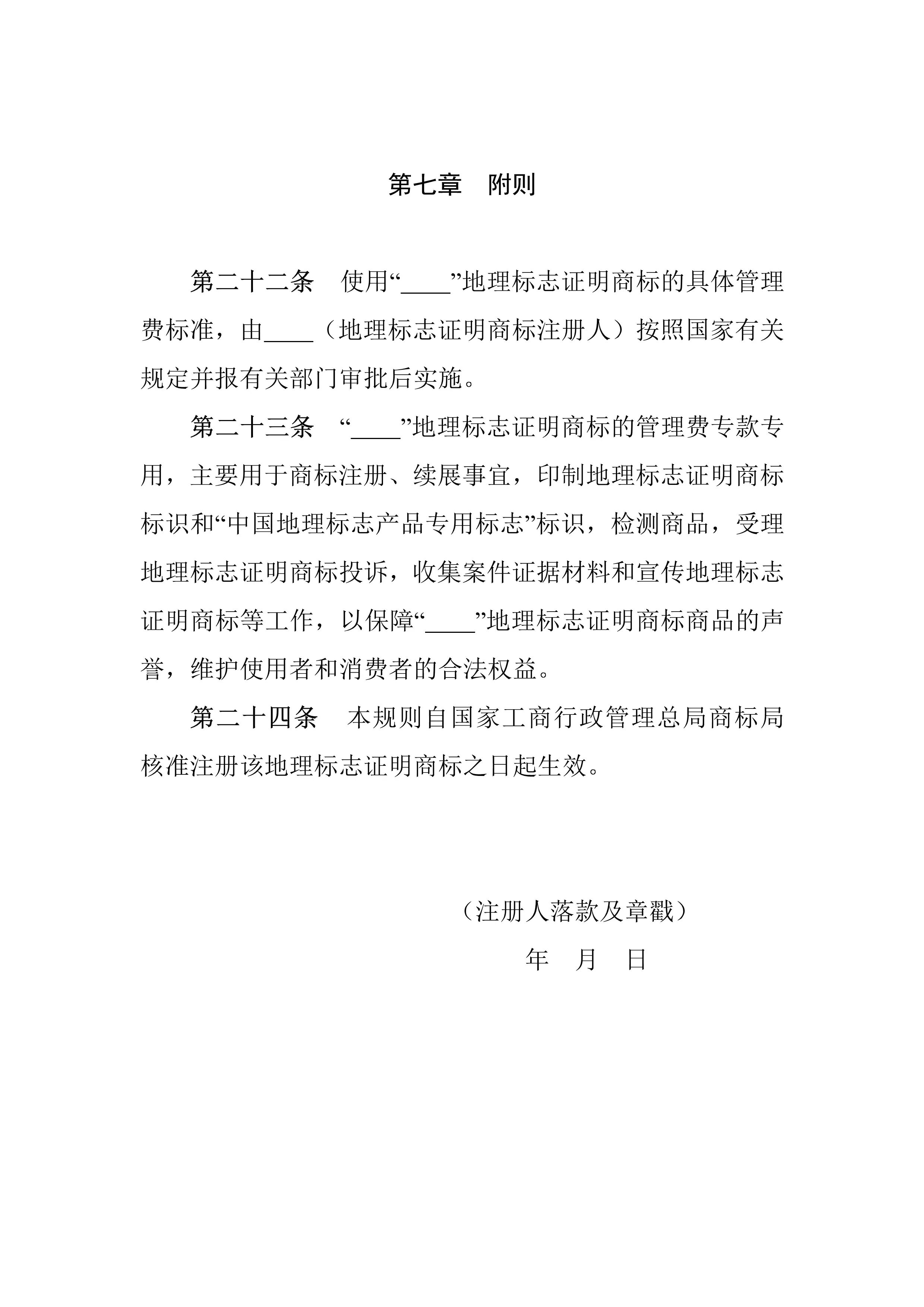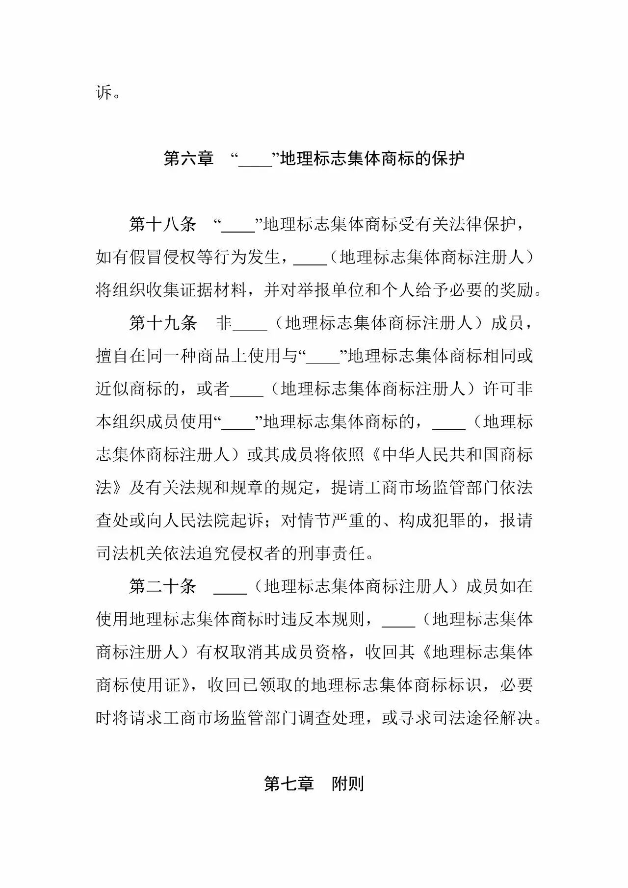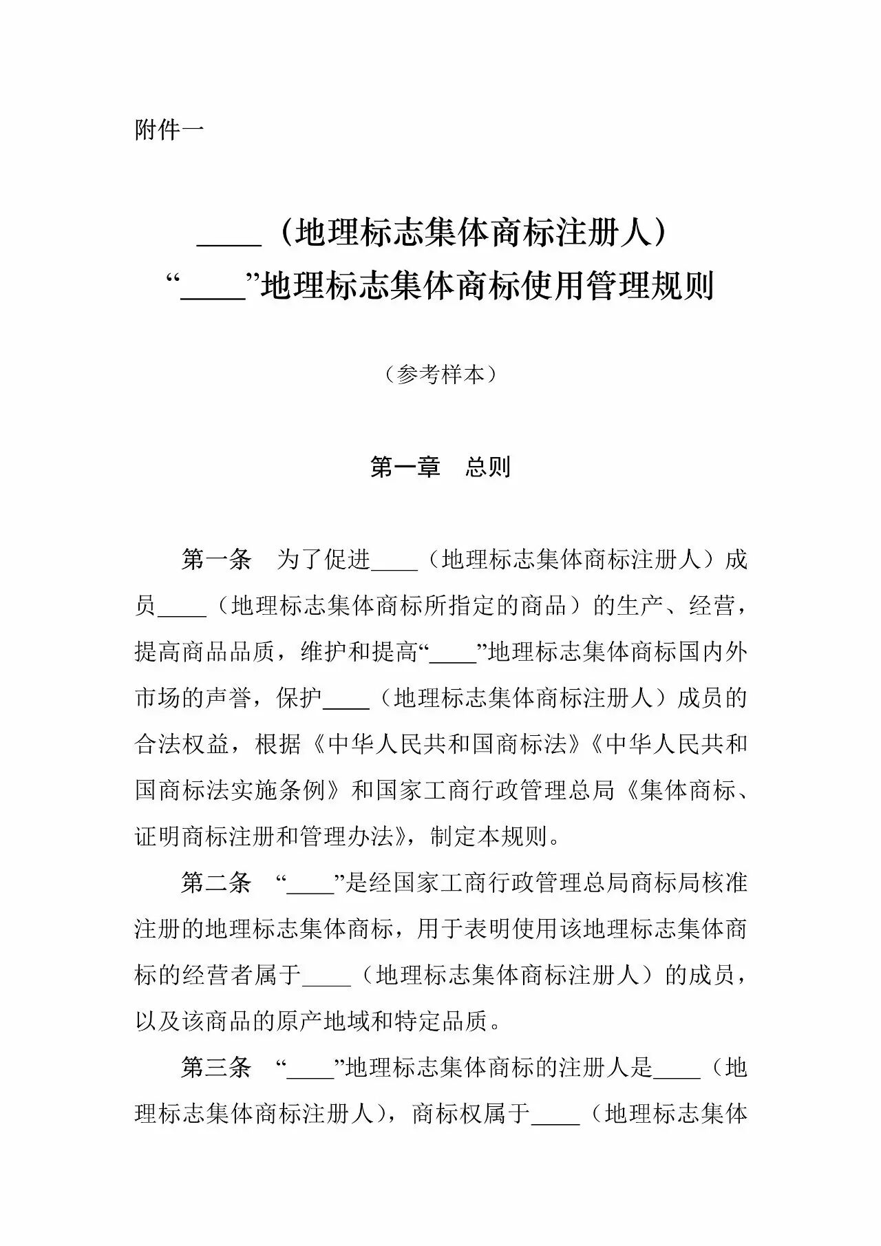 3.根据《商标法》《商标法实施条例》《集体商标、证明商标注册和管理办法》有关规定归纳整理而成的使用管理规则范本(见附件一、二,笔者根据自己的理解,对商标局官网上公布的范本做了修正)中,第五条不但应写明使用地理标志集体商标/证明商标的商品的生产地域范围(包括行政区划和地理坐标),还应描述该地域特定的自然地理环境是如何影响和造就了地理标志商品的特定质量、信誉或其他特征。