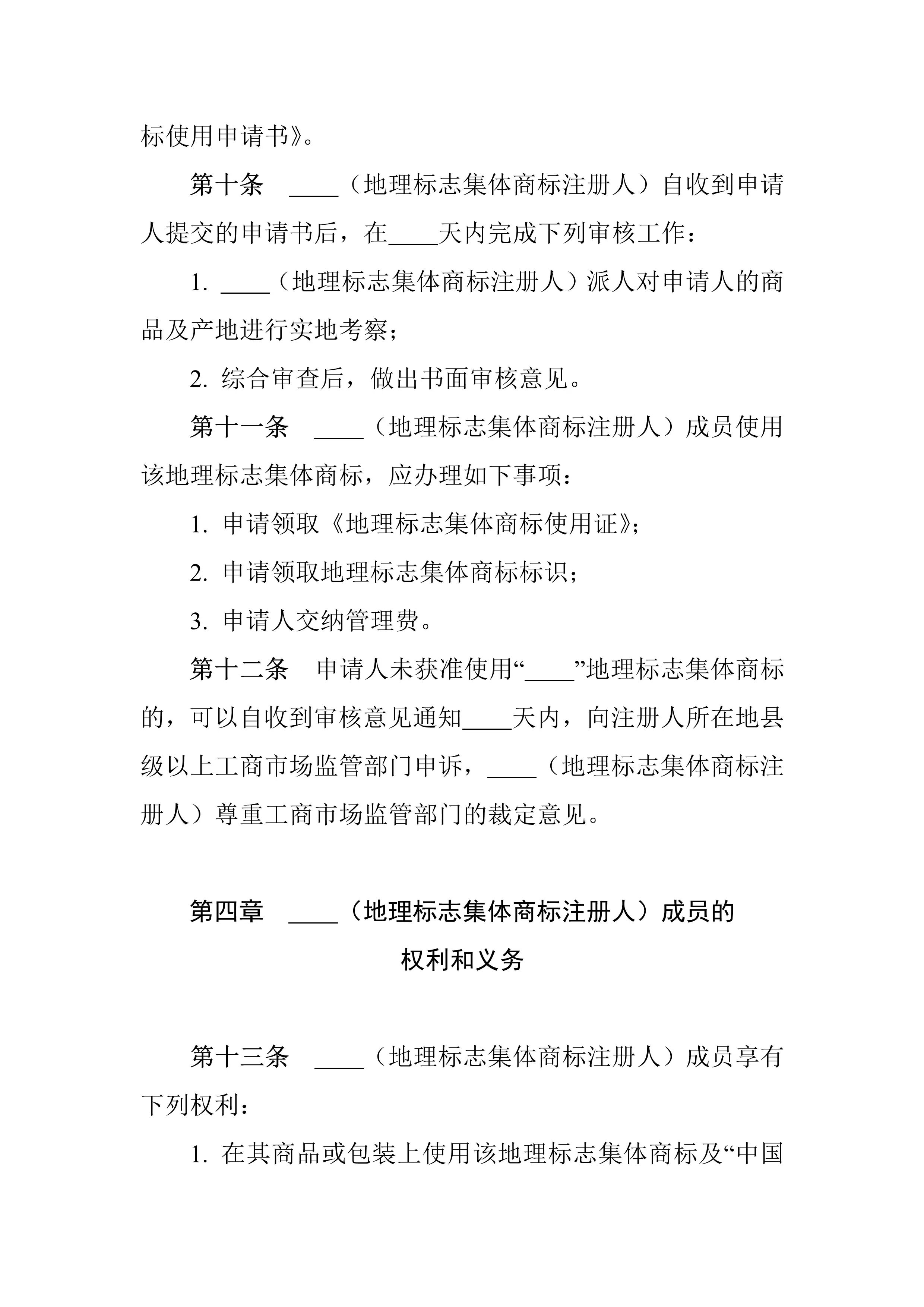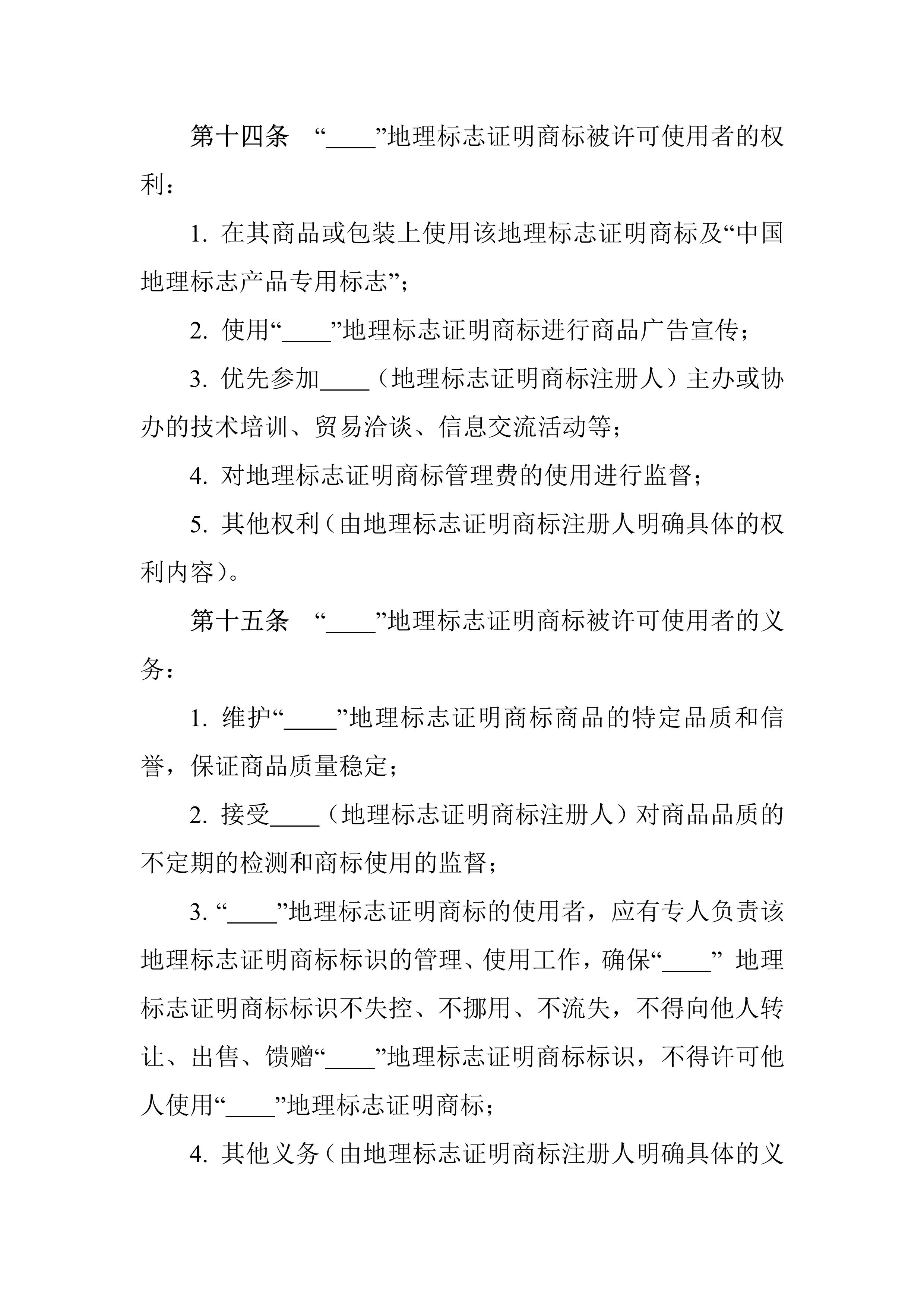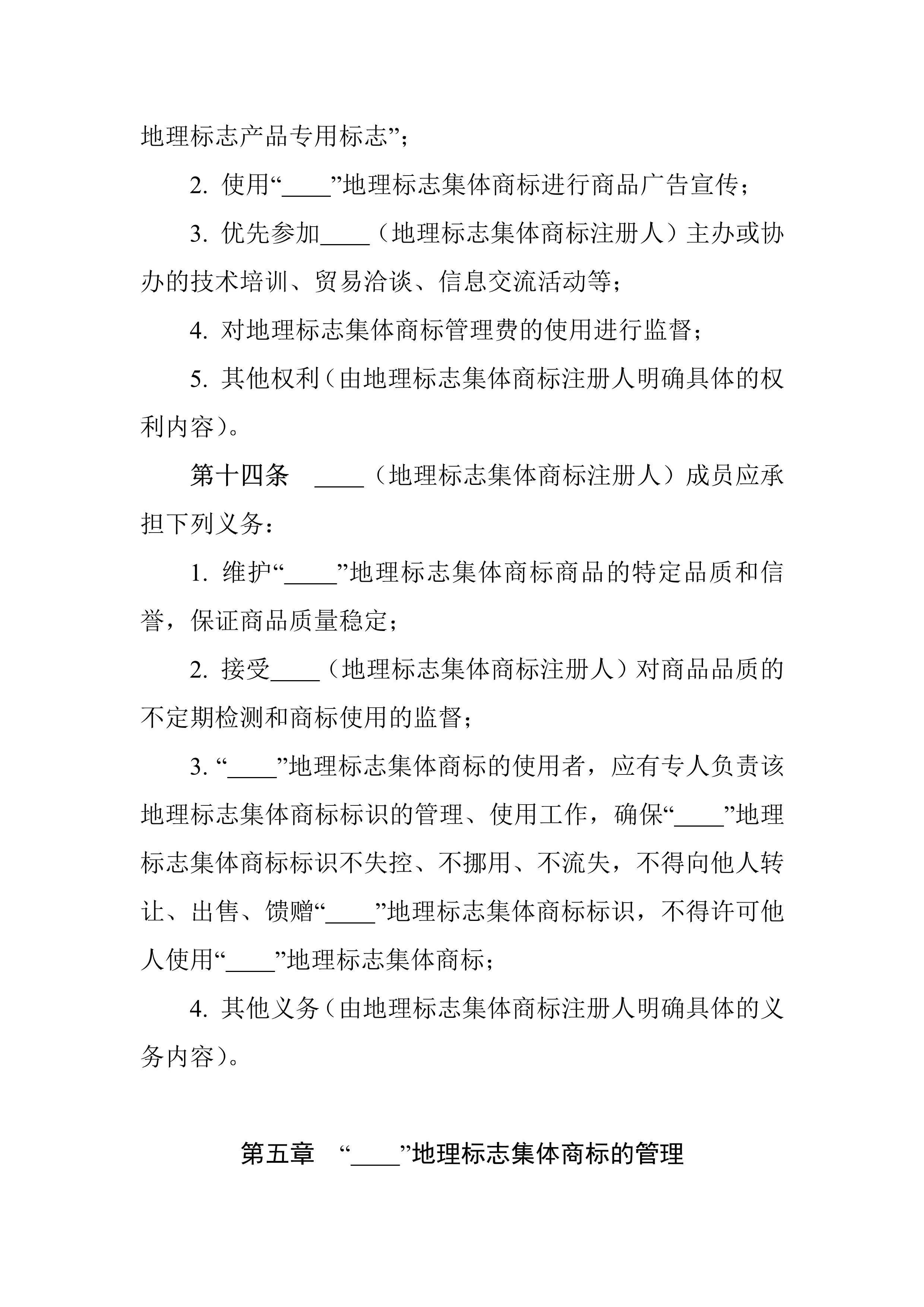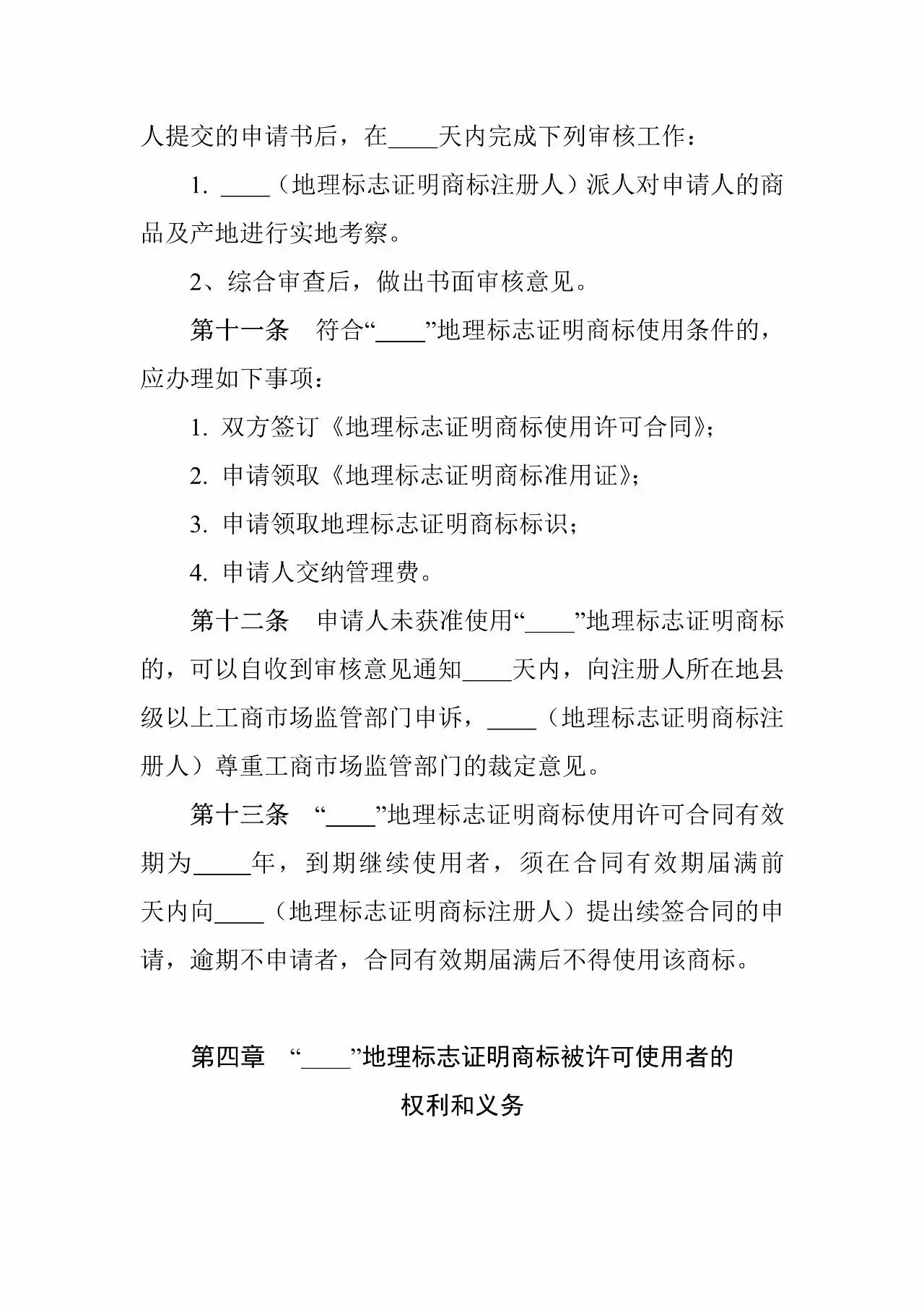 3.根据《商标法》《商标法实施条例》《集体商标、证明商标注册和管理办法》有关规定归纳整理而成的使用管理规则范本(见附件一、二,笔者根据自己的理解,对商标局官网上公布的范本做了修正)中,第五条不但应写明使用地理标志集体商标/证明商标的商品的生产地域范围(包括行政区划和地理坐标),还应描述该地域特定的自然地理环境是如何影响和造就了地理标志商品的特定质量、信誉或其他特征。