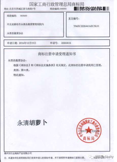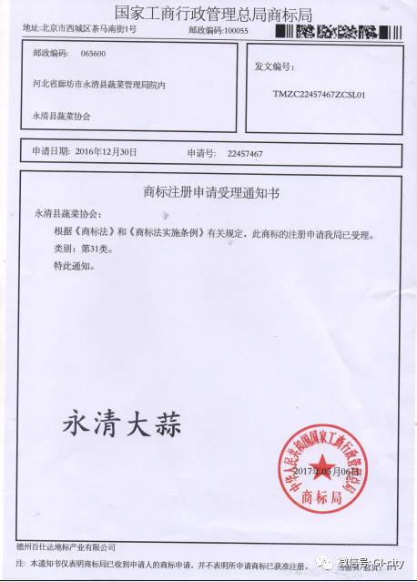 农业品牌化是现代农业的一个重要标志,也是推进农业和农村工作的重点。近年来,永清县提出了品牌带动战略,推进农业品牌化,紧紧围绕农产品质量安全、农业增效和农民增收这一主线,积极培植创建农业品牌。重视“永清胡萝卜”、“永清大蒜”两个产品的国家地理证明商标申报工作,目前两产品已由德州百仕达地标产业有限公司代理申报,被国家工商总局认证受理,并下发了认证受理通知书。