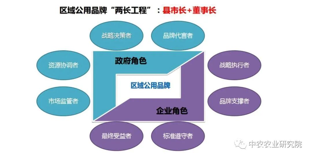 品牌创建的初期离不开政府的主导,这也是中农一直秉承的“两长工程”创建理念(县市长+董事长)。因为创建初期,政府是品牌战略的决策者、区域资源的整合者、品牌应用的监管者、区域品牌推广初期的代言者。完成品牌的顶层设计后,政府应适时地授权品牌运营机构进行市场化运营推广,政府给予相应的资源扶植。
