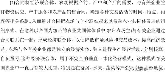 在美国逐步形成的大农业中,农场主合作社等农业服务组织虽然发挥了无可替代的作用,但是,起主导作用的是与农业相关的工商企业。私人工商企业与农业生产者的业务往来(相当于我们所讲的公司+农户),主要通过市场经济下一般通行的商业实践,即通过双方的商品、劳务交换进行或者通过双方的直接联合,形成某种或某类农产品生产和流通全过程的、一个个相对独立的小体系。