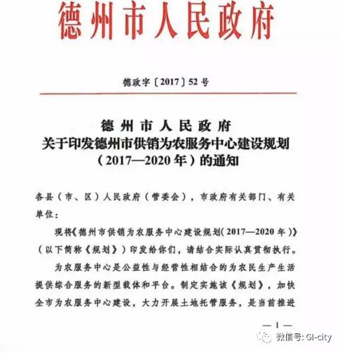 2017年8月24日,德州市委副书记、市长陈飞主持召开市政府常务会议,研究通过《德州市供销为农服务中心建设规划(2017—2020年)》,同日德州市人民政府以德政字〔2017〕52号文件予以印发。